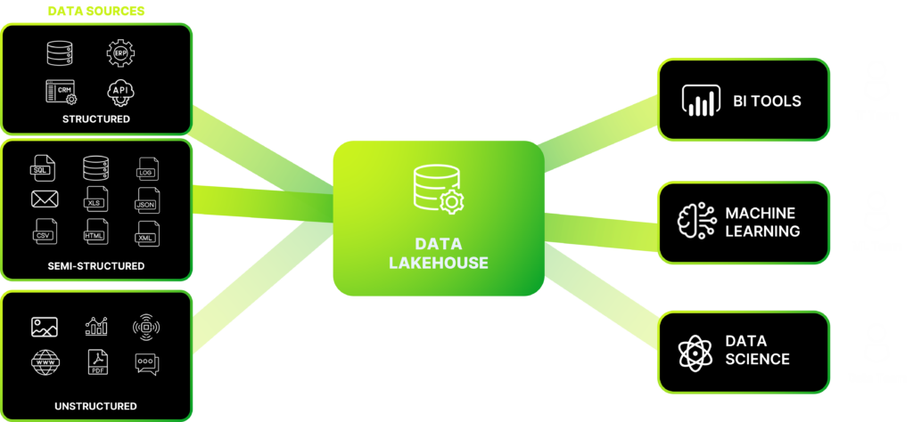 Integrating diverse data sources—structured, semi-structured, and unstructured—into a unified Data Lakehouse. This integration centralizes data for analytics but still requires advanced teams such as IT, Machine Learning (ML), and Data Science to process and extract insights effectively.